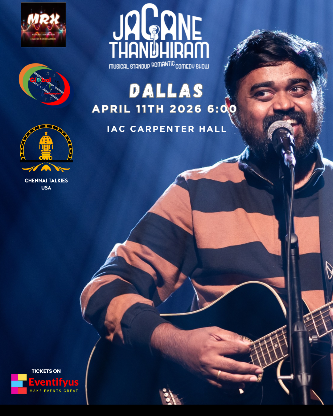 Jokes. Music. Love. He has got it all in this one package! 🌟 After successfully touring across the world, Standup Comedian JAGAN KRISHNAN is bringing his first and most close to heart show - JAGANE THANDHIRAM, a Musical Standup Romantic Comedy Show, to multiple cities in the 🇺🇸 USA for the 1st time ever!!! 🎤🕺🏽 Come catch this art of love filled with funnies live and get to know how he got through quite a few awkward & embarrassing heartbreaks before finally finding the love of his life in this hilarious musical journey! 😁🥰🎶 Jagane Thandhiram is packed with his quirky observational humour, original lyrics and music in his signature tone, relatable jokes and the craziest journey of a 90’s kid - his love story. :) FAMILY FRIENDLY | ORIGINAL SONGS | ROMANTIC-COMEDY MUSICAL | HEART WARMING | TAMIL & ENGLISH Book your tickets now, for a never-before musical comedy experience! 😁🎵