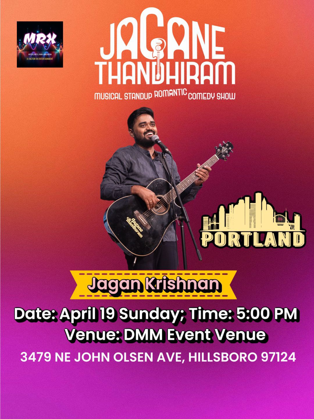 Jokes. Music. Love. He has got it all in this one package! 🌟 After successfully touring across the world, Standup Comedian JAGAN KRISHNAN is bringing his first and most close to heart show - JAGANE THANDHIRAM, a Musical Standup Romantic Comedy Show, to multiple cities in the 🇺🇸 USA for the 1st time ever!!! 🎤🕺🏽 Come catch this art of love filled with funnies live and get to know how he got through quite a few awkward & embarrassing heartbreaks before finally finding the love of his life in this hilarious musical journey! 😁🥰🎶 Jagane Thandhiram is packed with his quirky observational humour, original lyrics and music in his signature tone, relatable jokes and the craziest journey of a 90’s kid - his love story. :) FAMILY FRIENDLY | ORIGINAL SONGS | ROMANTIC-COMEDY MUSICAL | HEART WARMING | TAMIL & ENGLISH Book your tickets now, for a never-before musical comedy experience! 😁🎵 Brought to you by MRX Entertainment.